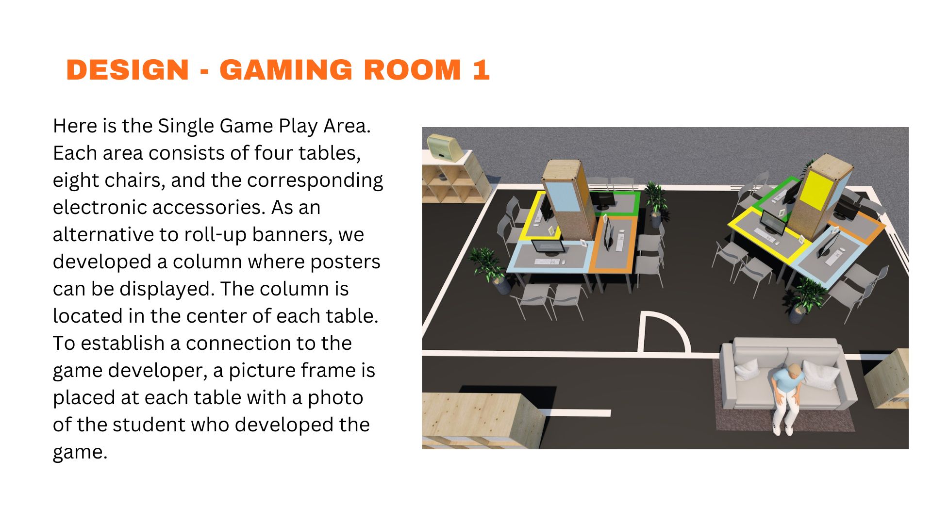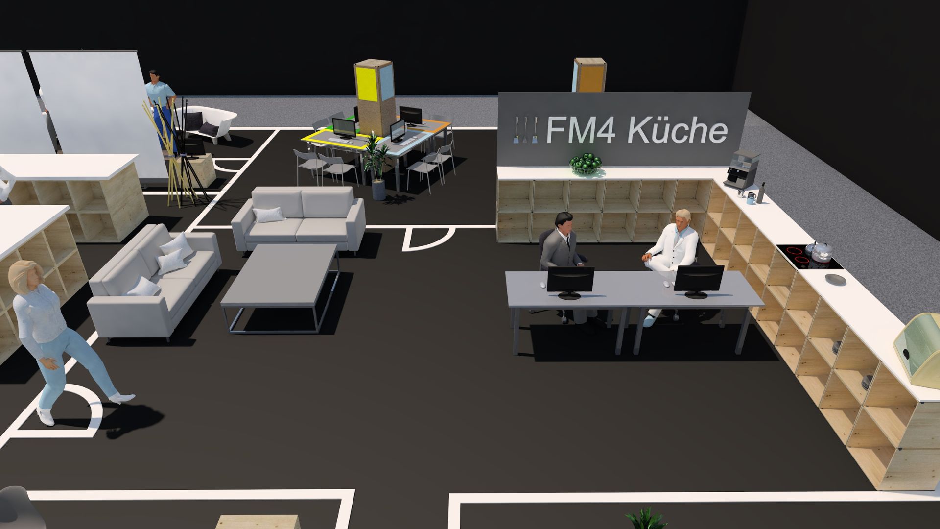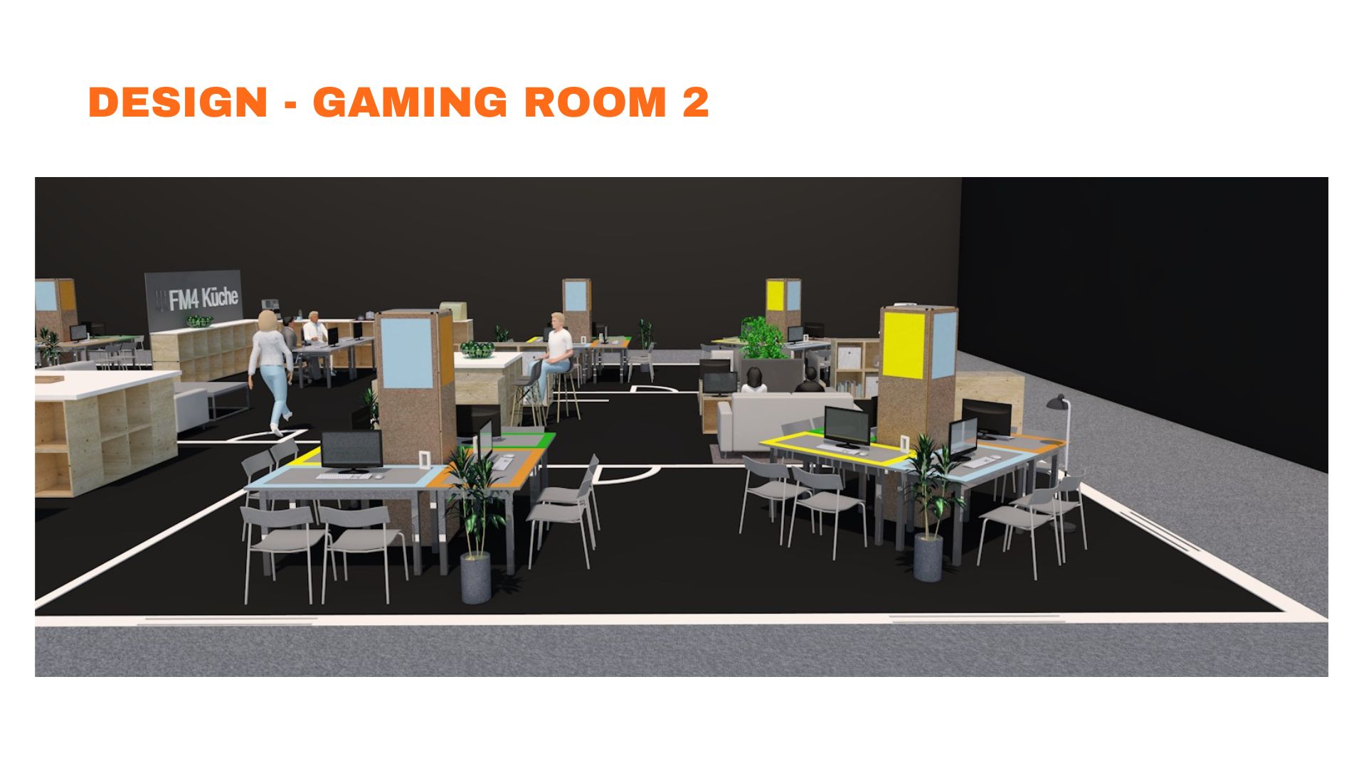 For the gaming fair in Salzburg, a booth for the Media Design program at FH Salzburg needed to be designed. The challenge was to work with a given list and utilize furniture and equipment already available at the FH. Our goal was to work as cost-effectively as possible and spend little to no additional money. The booth had to include the following areas: information desk, FM4 live broadcast area, multiplayer gaming area, single-player gaming area, and virtual reality area.